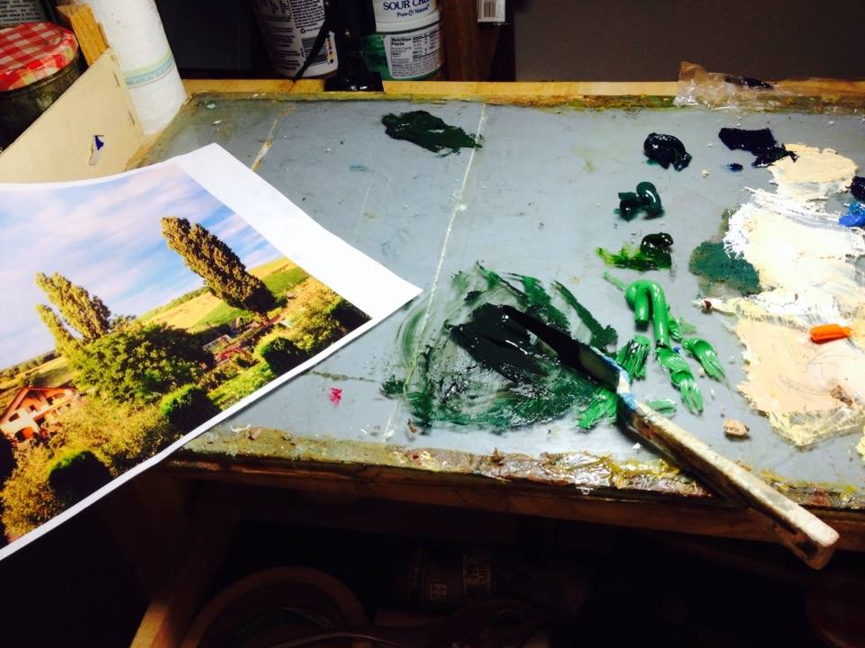 After the canvases dried, I sketched (from photographs) each of the images using willow charcoal. Because I am working with so many images and mostly landscapes I had to have a way of organizing them. I created a list numbering and naming each piece with the canvas size. I put the names on the back of the canvas on the stretcher bar and also on the photograph source.