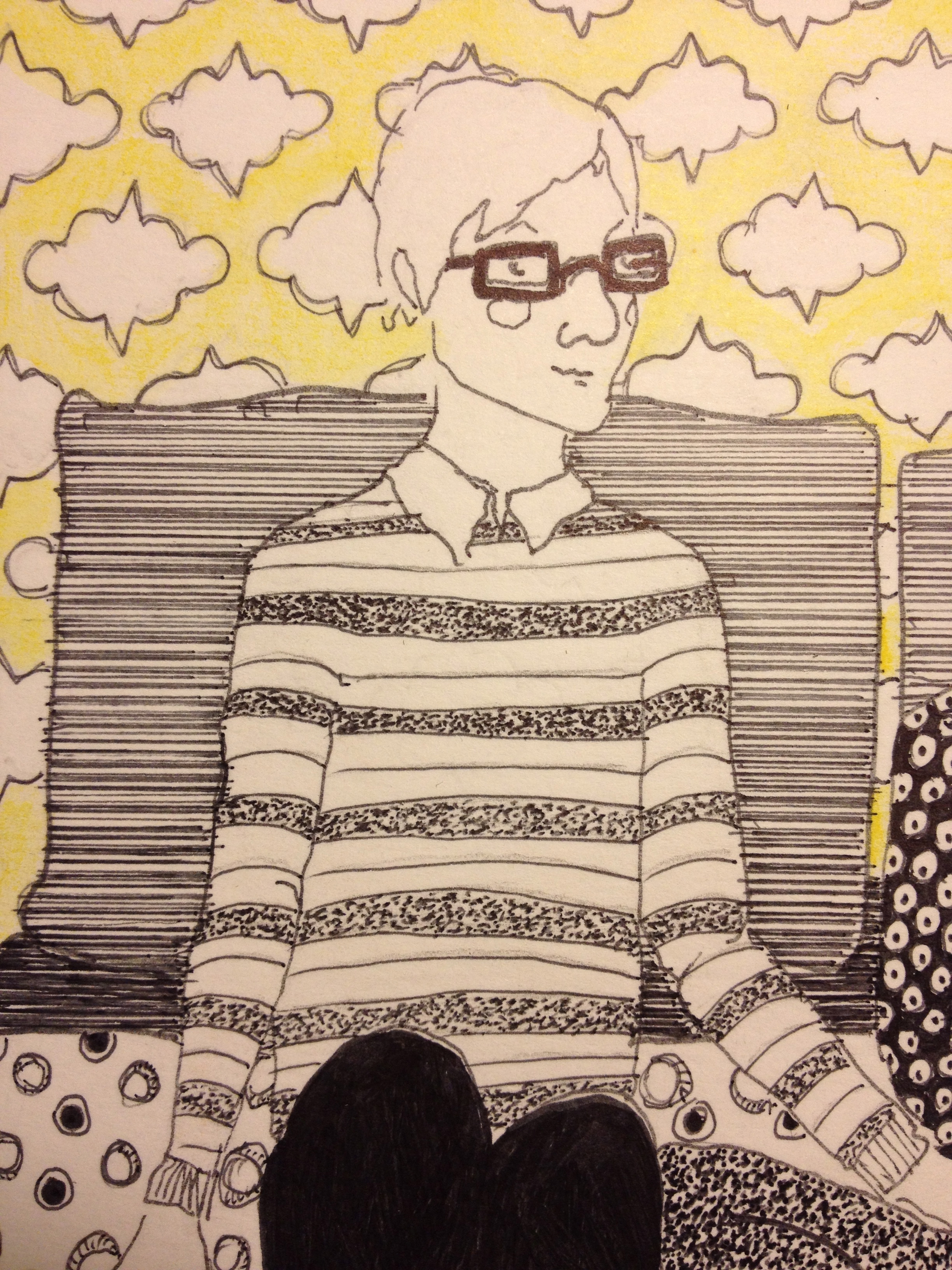 Some details I like about this piece: the yellow patterned wall in the background and the patterned blanket