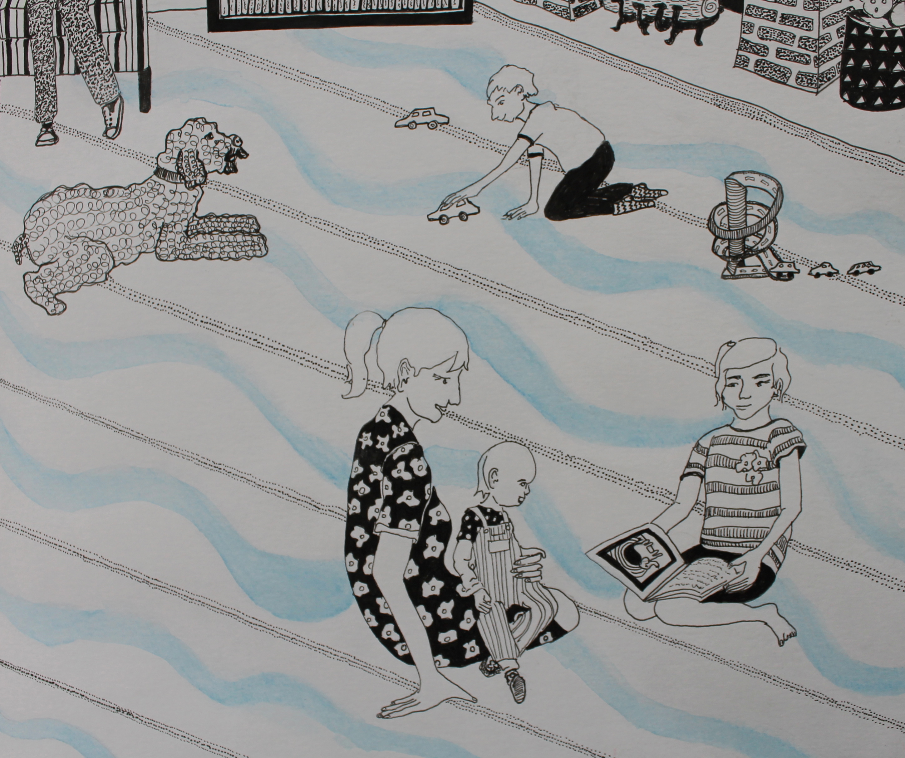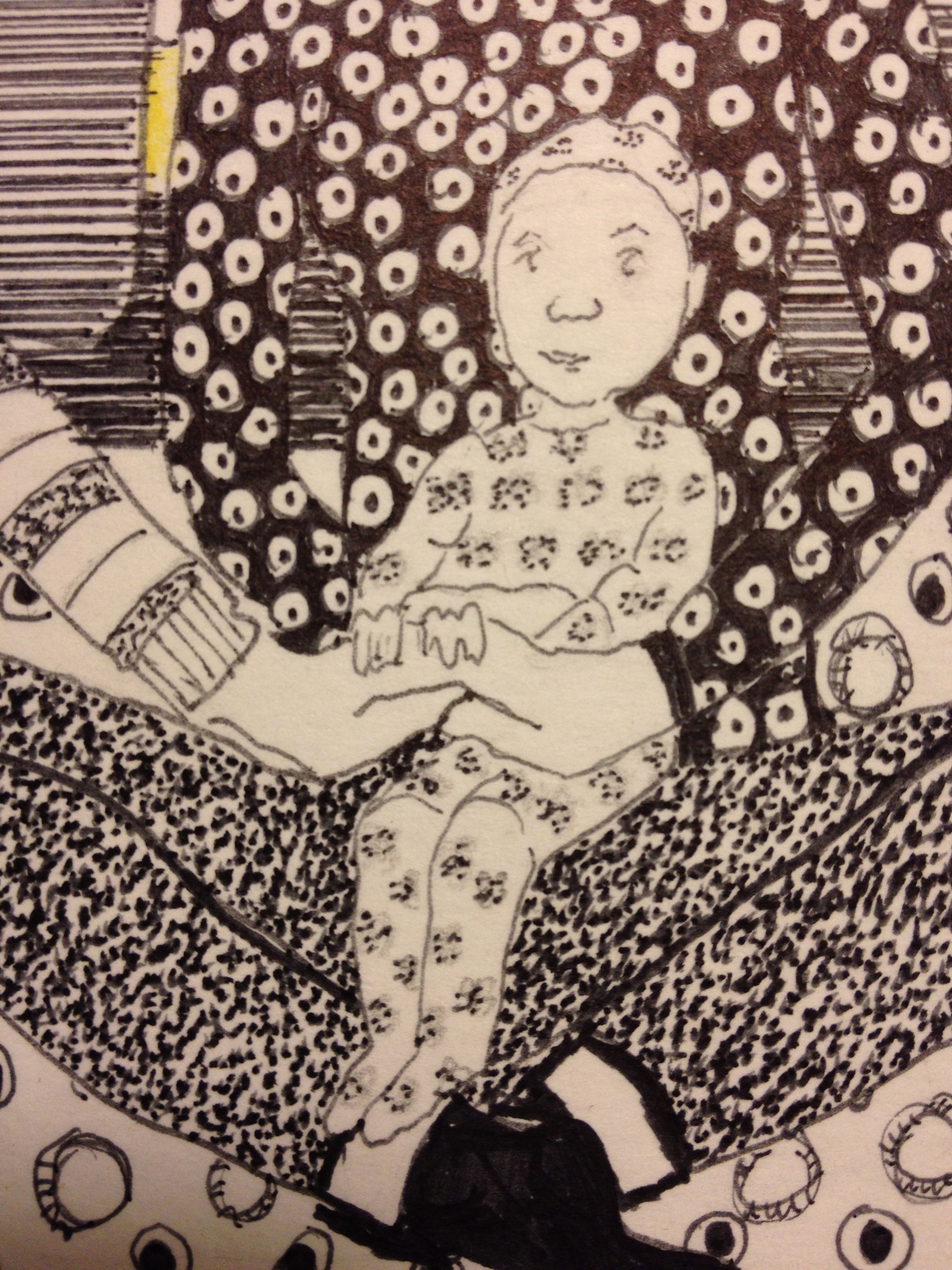 Some of my favorite things about this drawing are Nana’s daughter reading to E,