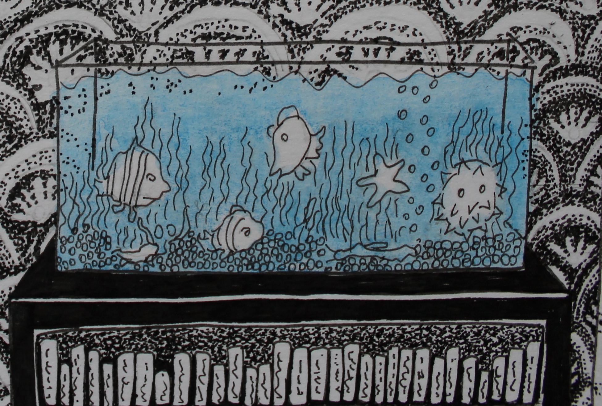 “Finding Nemo with Friends” features some of our friends from Arkansas (and Romania). Our friend Nana and her three kids were so amazing to help me navigate the land of having a kid. We were invited over – an open invitation – for whenever we wanted. Nana’s husband put together a “Finding Nemo” fishtank and E loved watching the fish. I used Inktense pencil Iris Blue for the color and used it on the water in the fish tank, the sky in the Romania painting, and placed a wave pattern on the rug.