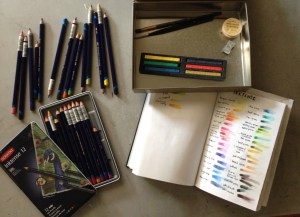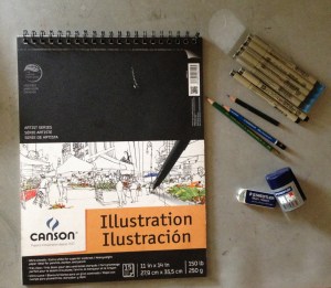 I am working with Inktense pencils, Micron ink pens, and Canson Illustration 11×14″ 150lb art pad to create 15 illustrations (that is how many pieces of paper are in the art pad) of my current family life and inspirations.