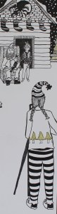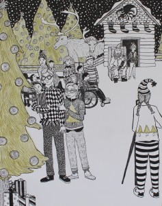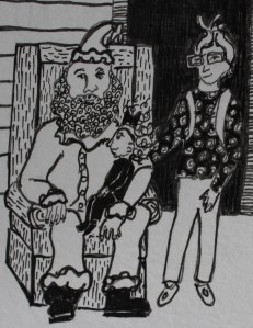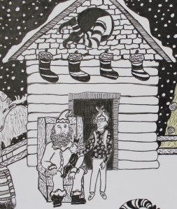 My favorite things about this drawing are the “Santa’s elf” photographer, Santa’s little log cabin set up, and my friend Stashia and her daughter Avi meeting Santa,