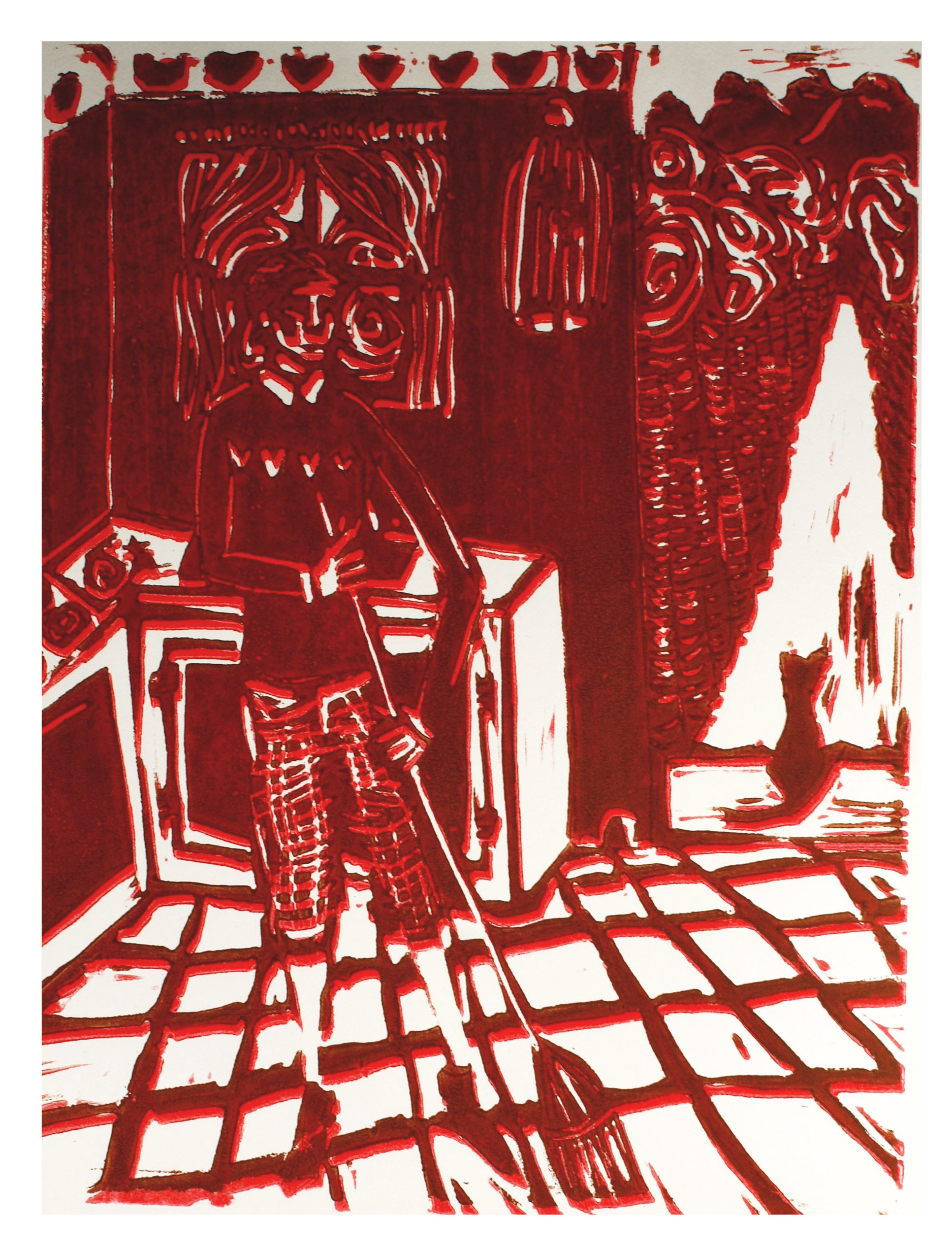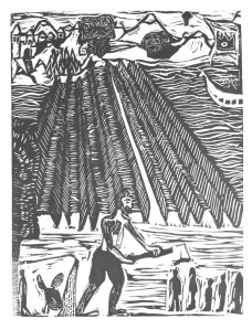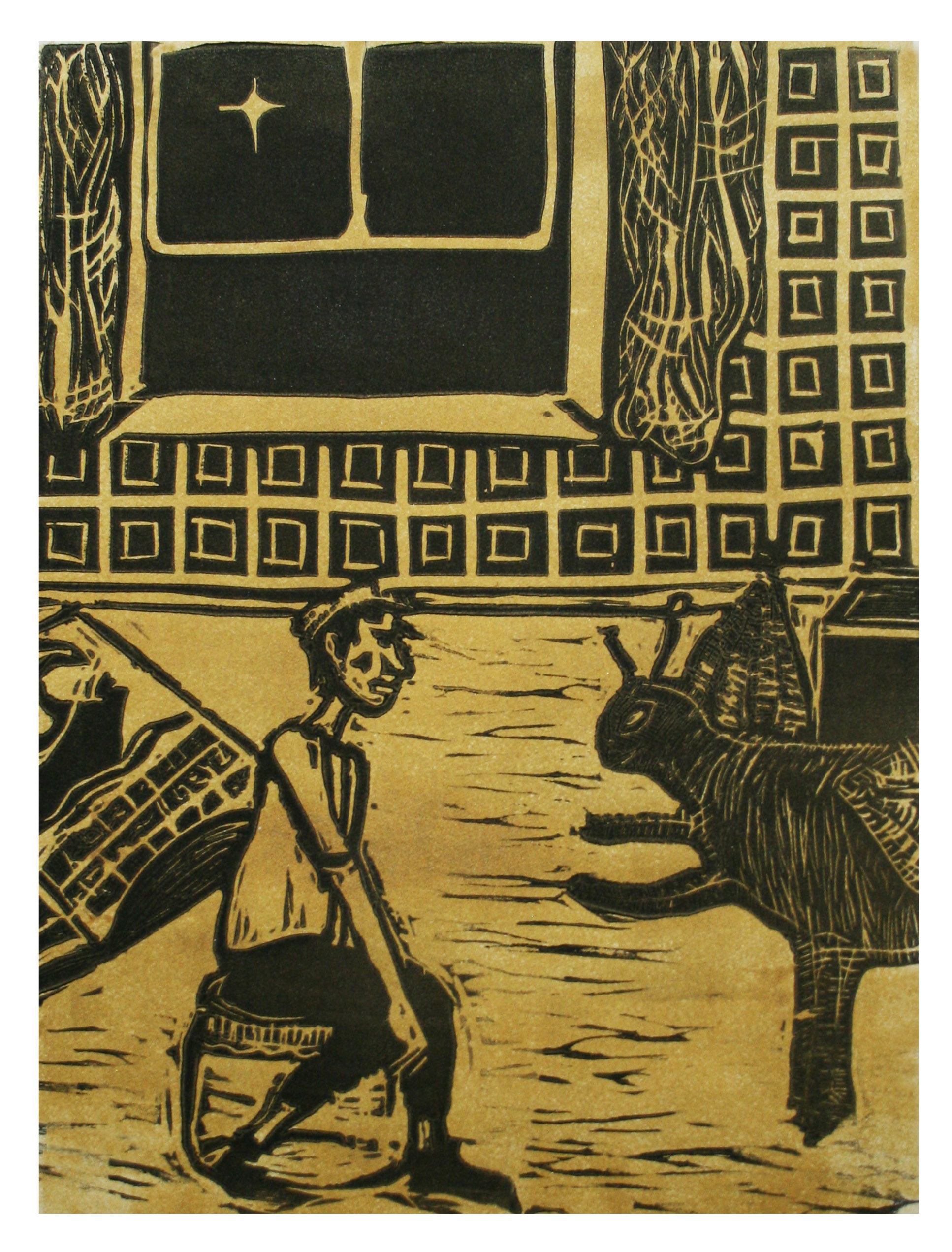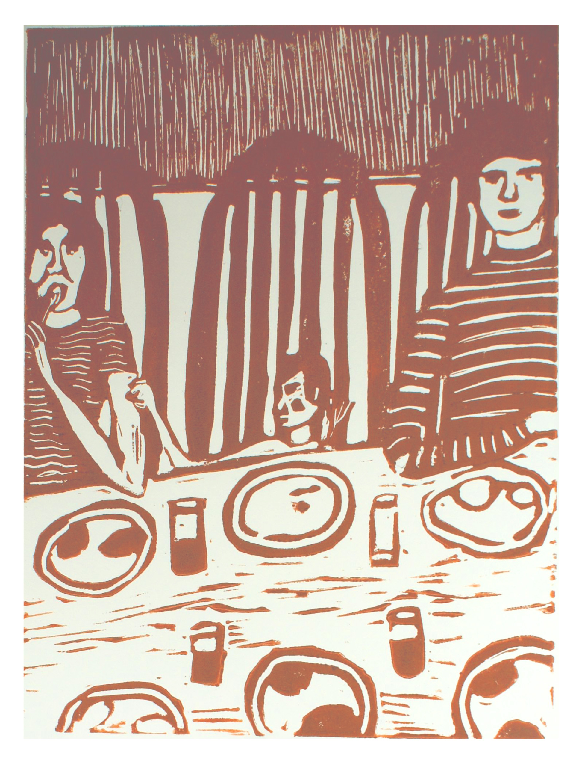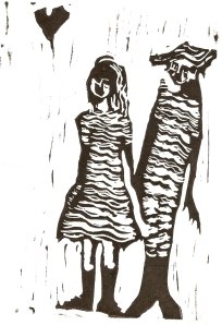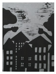 Lauren: Basically, they are linoleum block prints. And some of them are multi-colored. That means that, well, I used a wooden spoon transfer cause I didn’t have access to a press. So, each one of the blocks were inked up, and then a piece of paper was put over it, and then I rubbed a wooden spoon across the back of it. And that’s how the prints’ made. so, if it’s multi-colored, that means I did that twice. And there are I think 13 or 14 illustrations, so as you can imagine, there was just ink and paper all over our little studio apartment at the time. And then I also wanted to hand bind the books, so it was a lot of work, but I feel like that’s kind of what we like. We like a challenge.