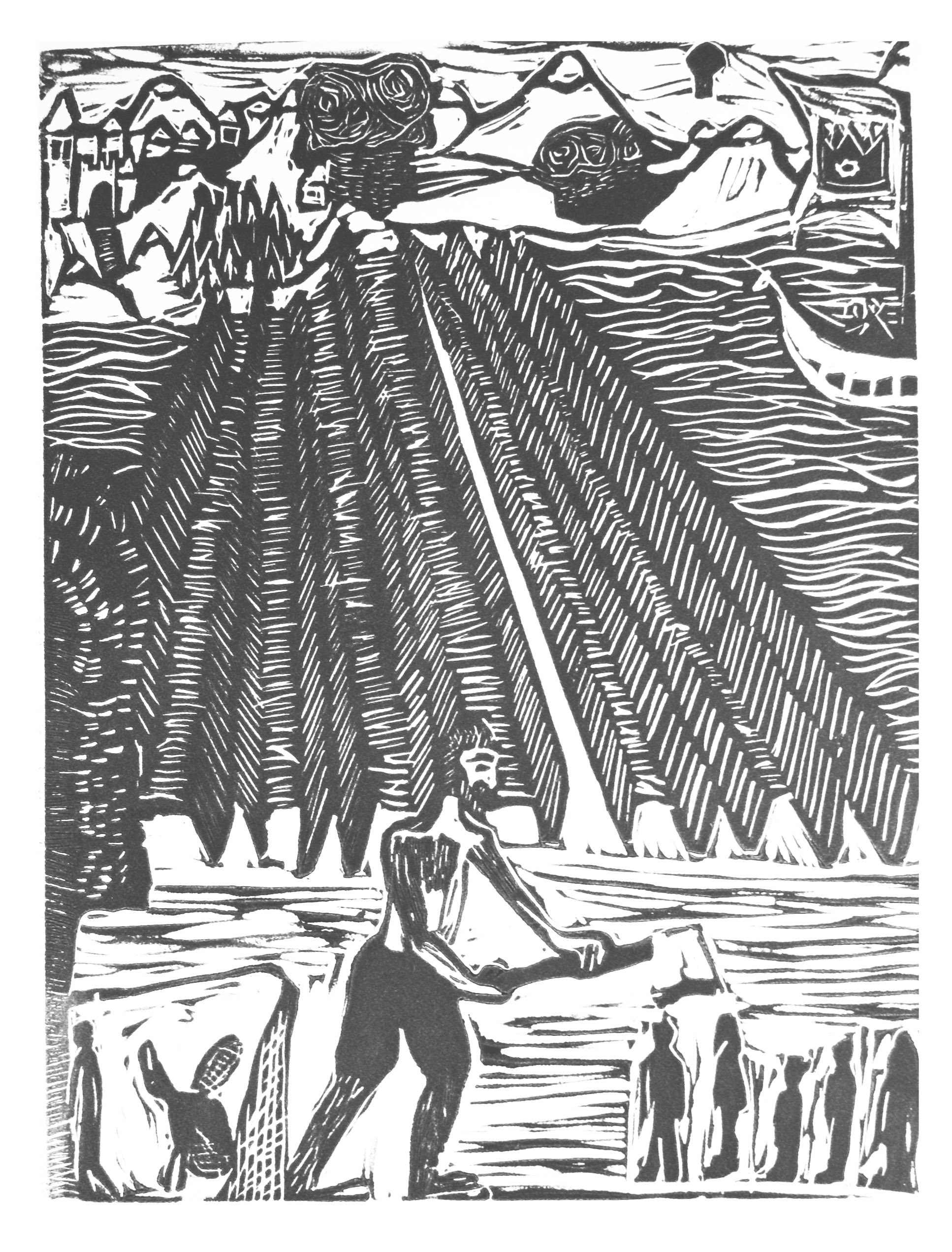 Lauren: It is the prince watching from the doorway and the princess dancing. And I used two colors, so that it would look like a shadow and then a shadow of the shadow. The woodland creatures would be very abstract. Are they in her dress? Are they on the outside and their shadows are reflected on her dress?