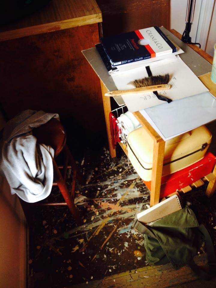 “The tight quarters in my studio are a challenge to work around and simultaneous projects do get in the way of each other resulting in this series of pictures which serve to highlight chaos as an aspect to the creative act.”