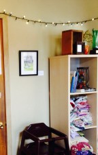 Once I set up the pieces, I realized that one of the plaster walls wouldn’t take any more holes, so I had to improvise and ended up using extra spaces I found.