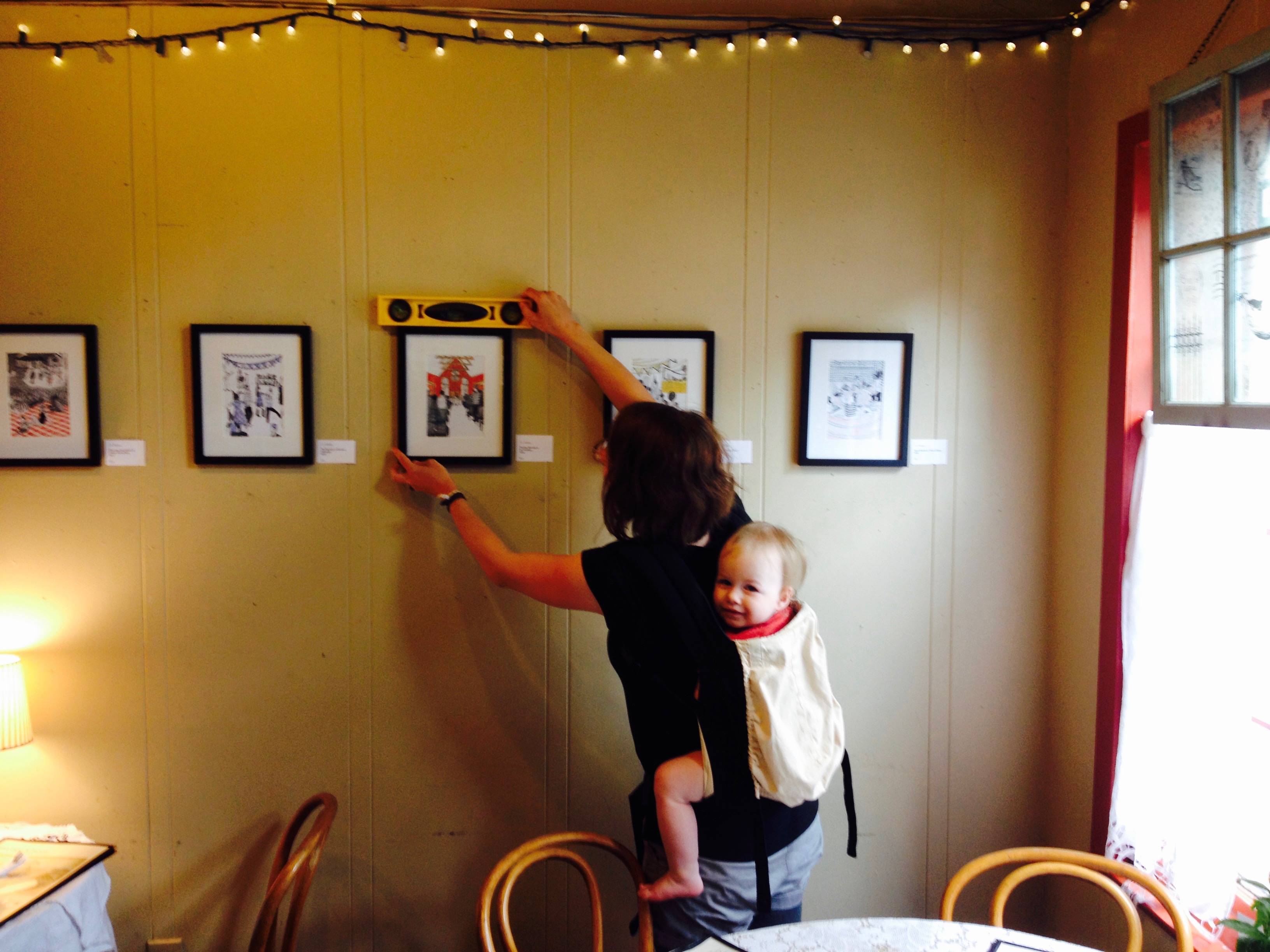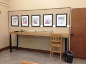 I decided that the “Family Life Illustration” series at 11×14″ in 16×20″ frames would work well in this community space visually and conceptually. M helped me carry in all of the work and art hanging supplies. I set the pieces against the wall to decide on placement.