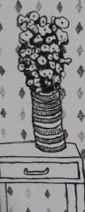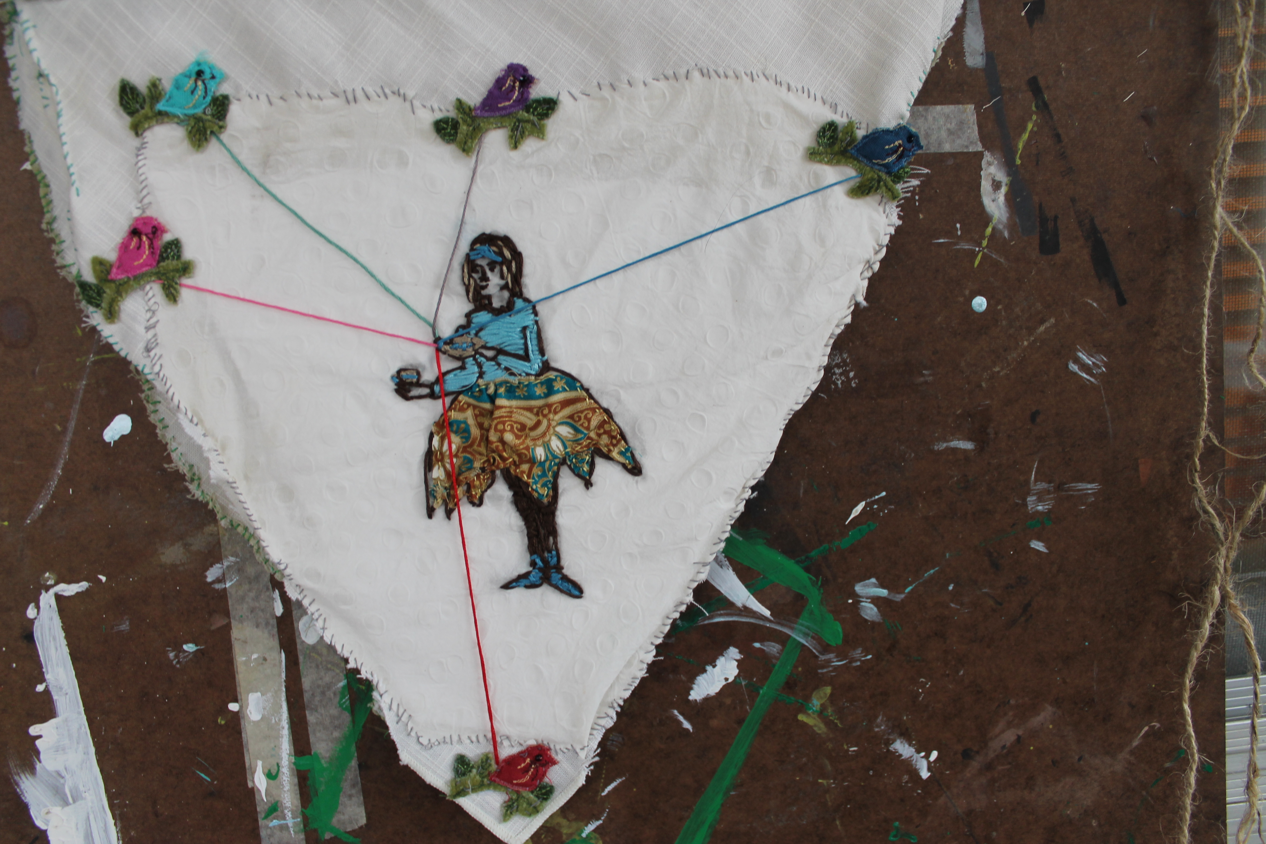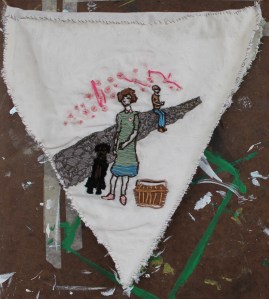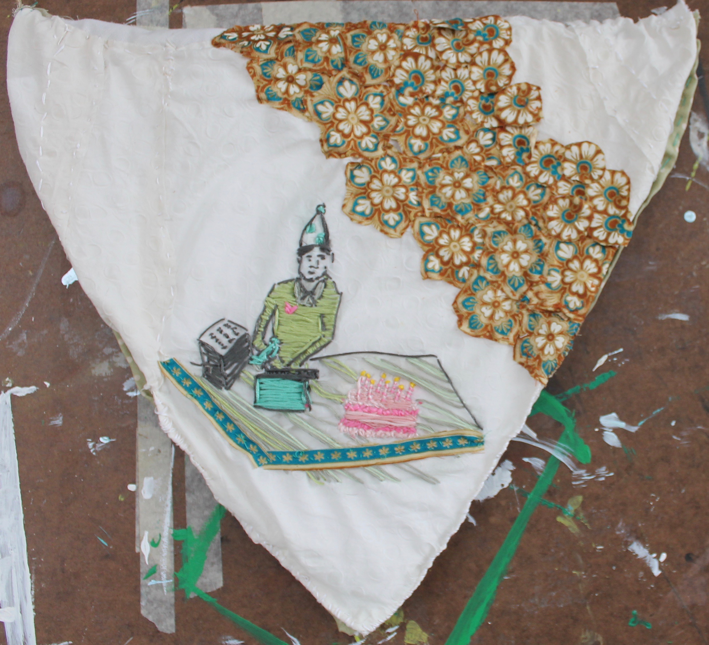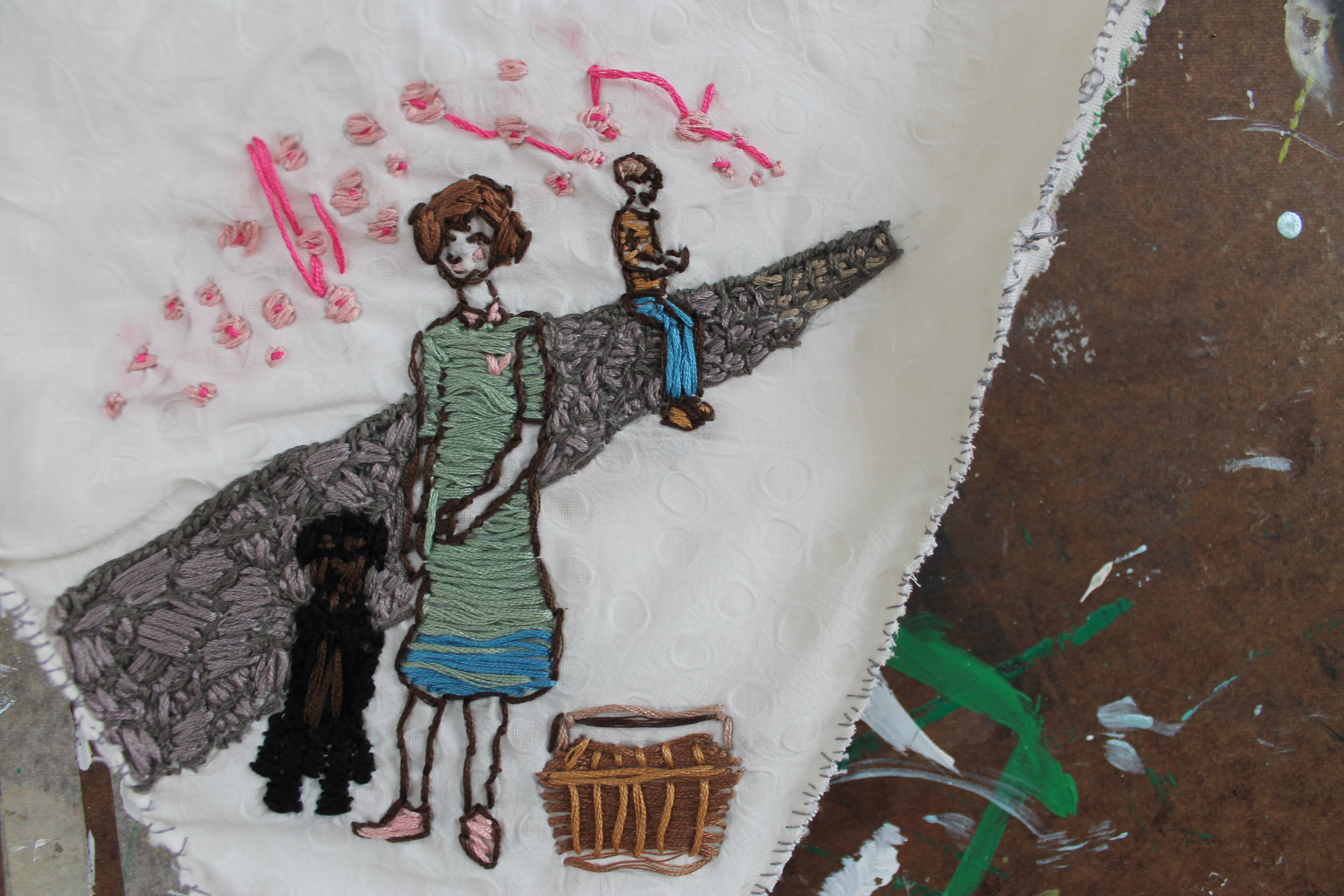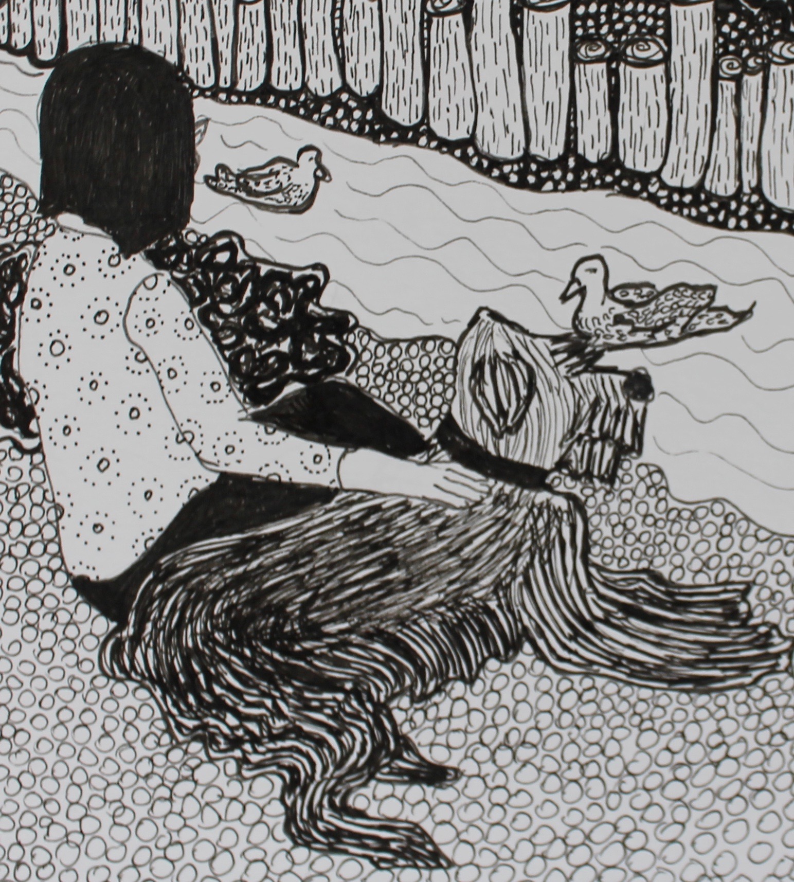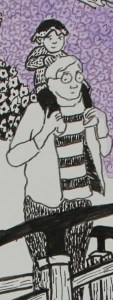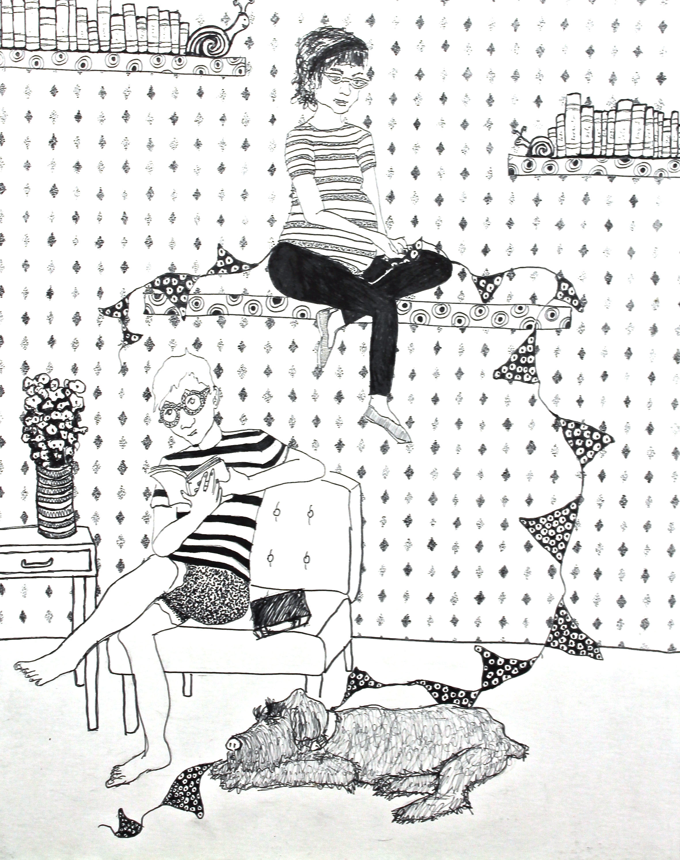 “Getting Ready” is the first and last drawing in the series. I drew it at the beginning of the series and it’s a bit of a “nesting” time before E was born. I wanted to discover during this series how our lives would change socially and in our community once we had a baby. After finishing the drawing, I decided to color each pendant from each of the drawings in the series (which made this drawing technically the last one completed). The colors would eventually represent all of our adventures together, but in the drawing it would just be my daydream.