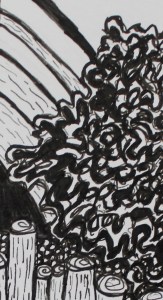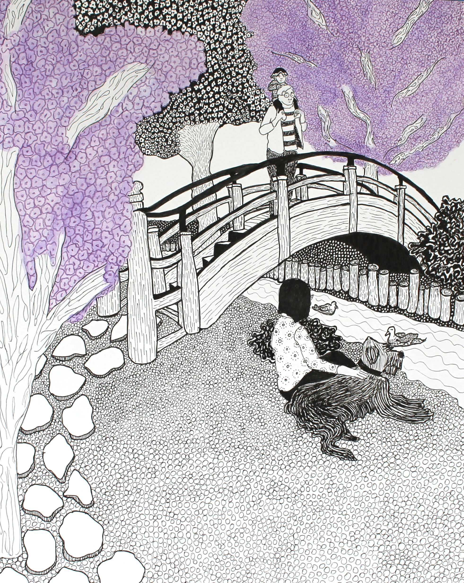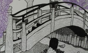 “Exploring the Japanese Stroll Garden” is just one of many times we have been to the Mizumoto Japanese Stroll Garden in Springfield, MO. We all love to walk around and explore what the different seasons have to offer in the garden. It is such a relaxing and calm place to be. I used Inktense pencils Mauve and Violet blended for the purple blooming trees.