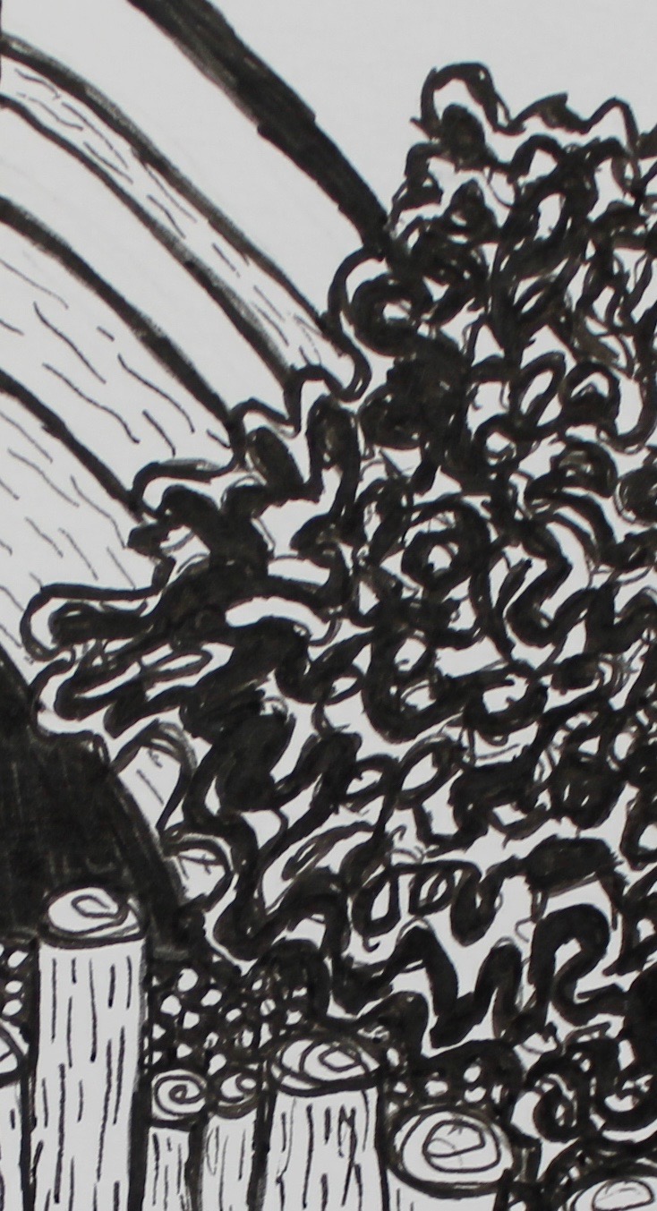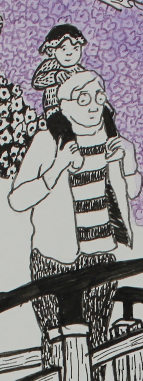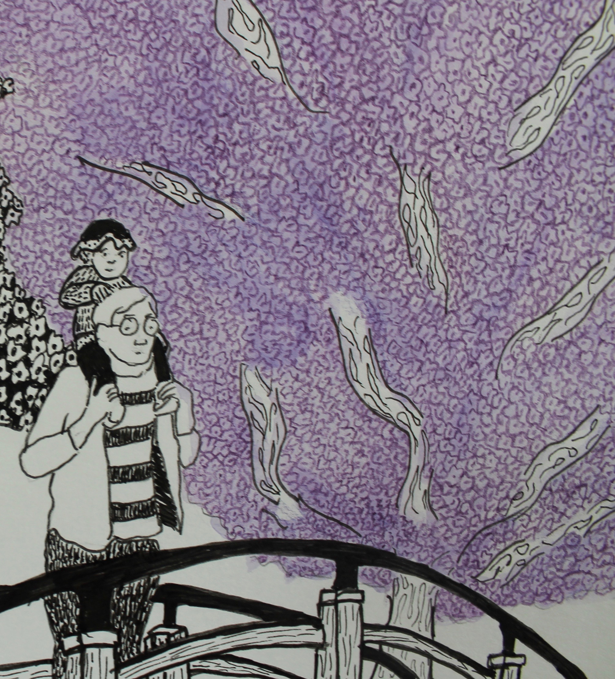 My favorite things about this drawing are the bridge and Micah and E looking off of the bridge,