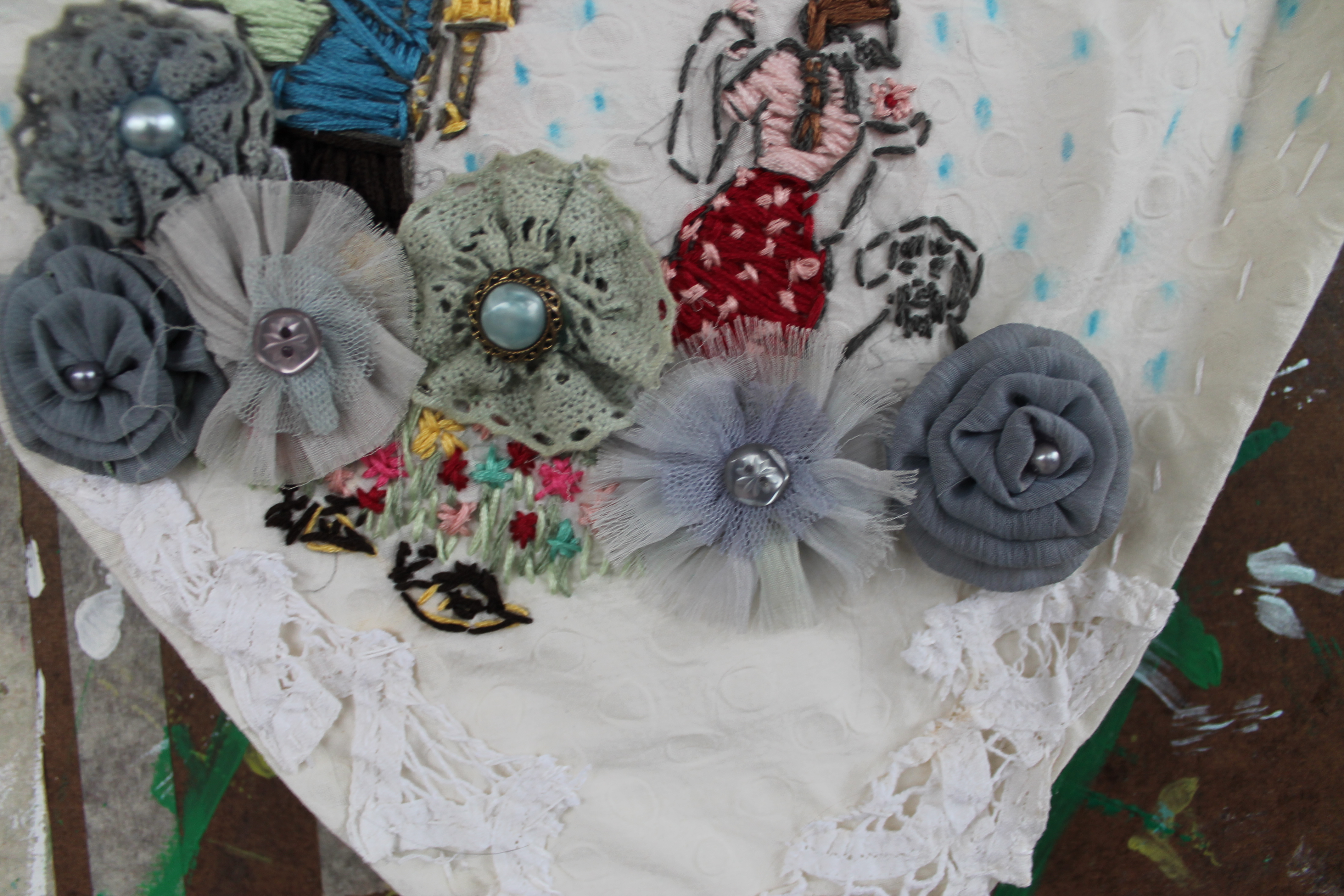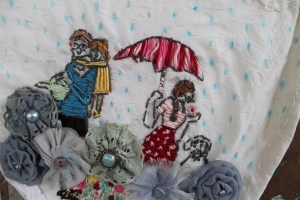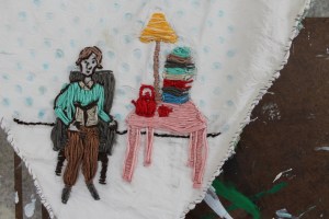 Lauren: It is the prince watching from the doorway and the princess dancing. And I used two colors, so that it would look like a shadow and then a shadow of the shadow. The woodland creatures would be very abstract. Are they in her dress? Are they on the outside and their shadows are reflected on her dress?