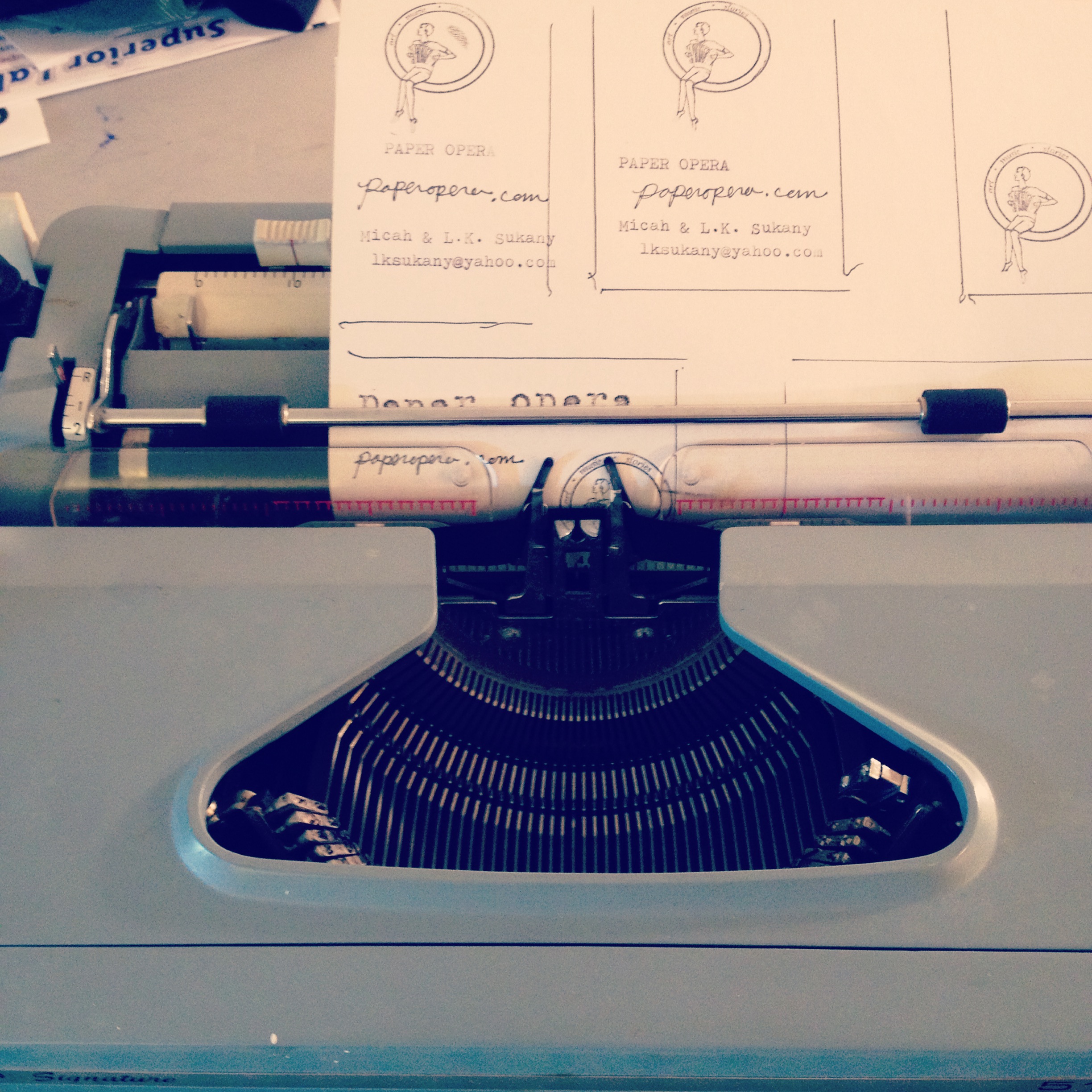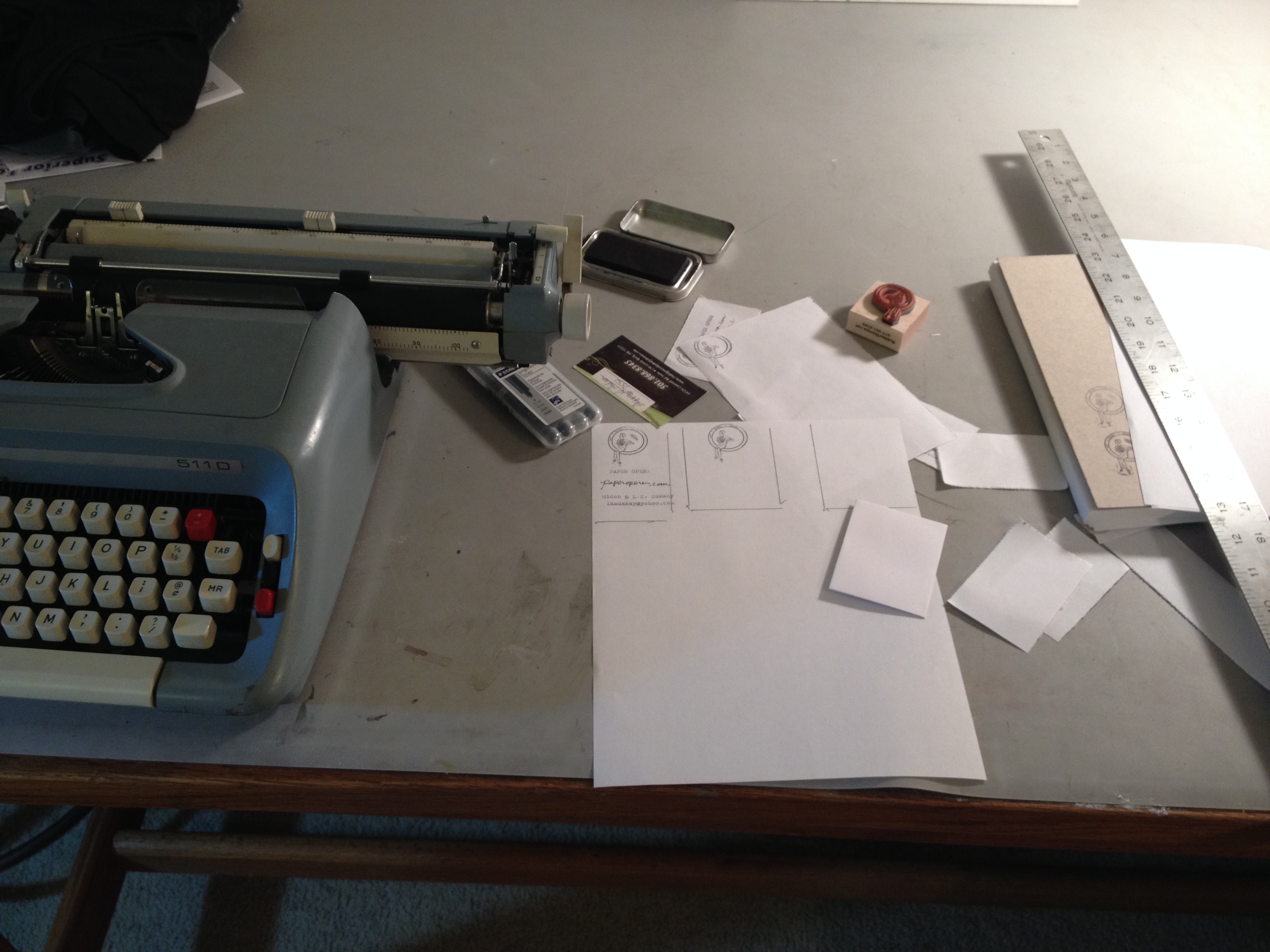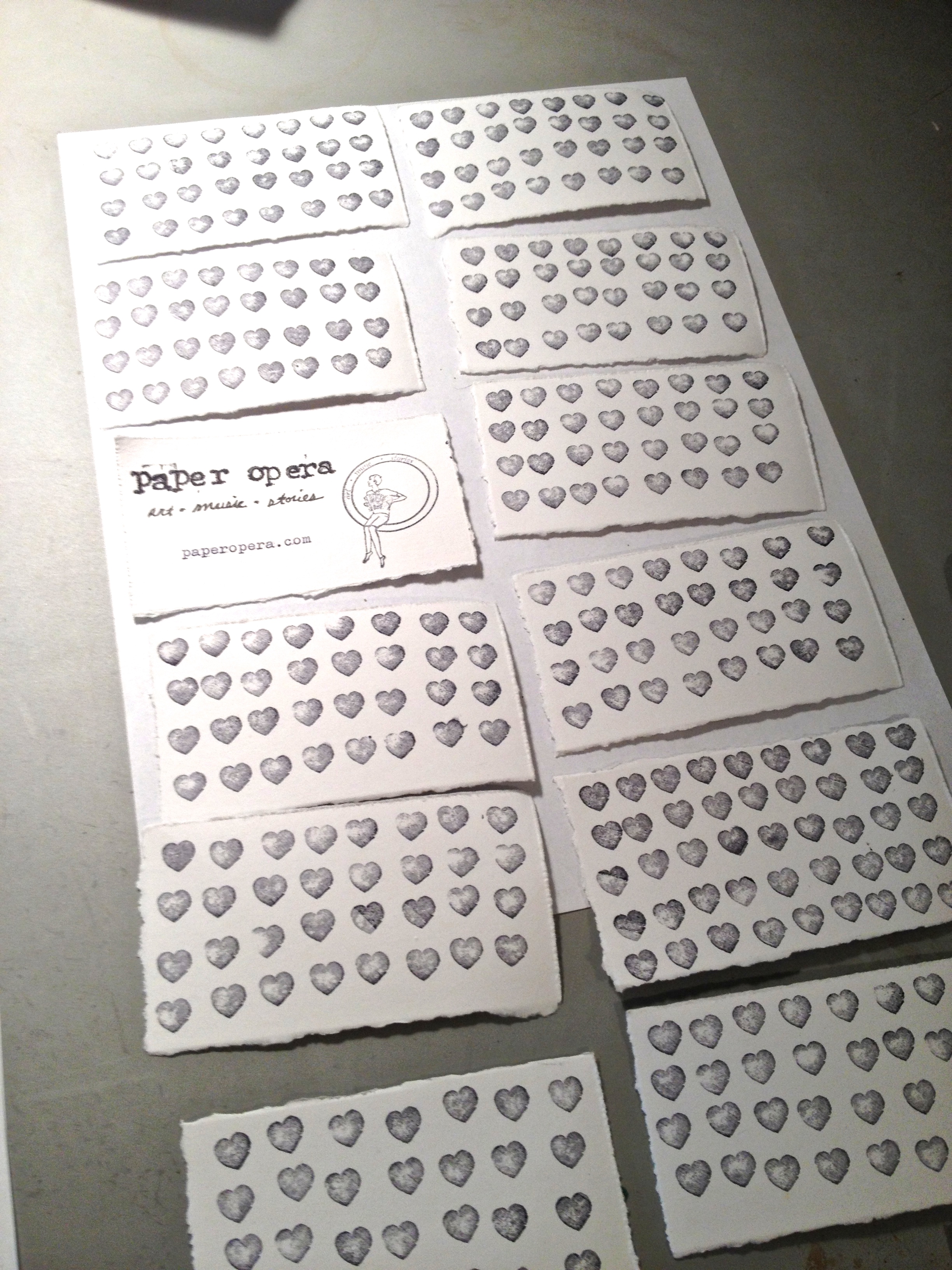 I created the business cards using hand torn paper, typing, and stamping. I first drafted the layout, stamped, and typed. I wanted to include the business name (Paper Opera), the website (paperopera.com), and the tag line (art, music, stories).