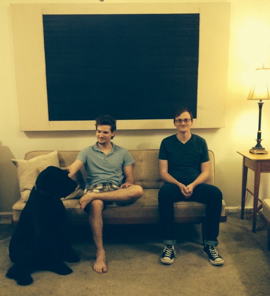 The first thing to do was determine position. We knew it should go behind the couch but how high above it? Micah took a seat and we measured a comfortable distance above his head from the floor. To that measurement we added the height of the painting, extended the tape measure and held it against the wall.
